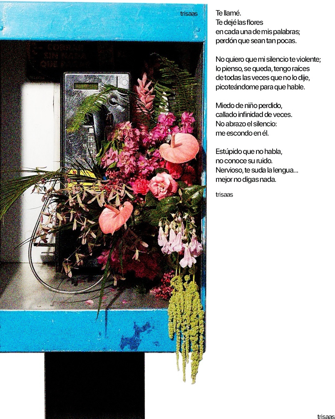 Trisaaaas es un artista emergente de Ciudad Juárez cuya práctica se mueve entre la ilustración, el texto y la exploración emocional. Su obra nace desde la vulnerabilidad, utilizando fragmentos de pensamiento, confesiones y estados mentales como materia creativa.